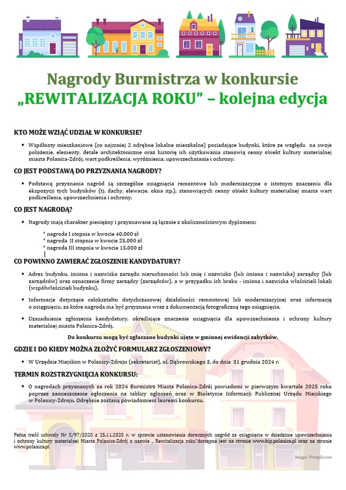 Pełna treść uchwaly Nr X/97/2020 z 25.11.2020 r. w sprawie ustanowienia dorocznych nagród za osiągnięcia w dziedzinie upowszechniania i ochrony kultury materialnej Miasta Polanica-Zdrój o nazwie "Rewitalizacja roku" dostępna jest na stronie www.bip.polanica.pl oraz na stronie www.polanica.pl
