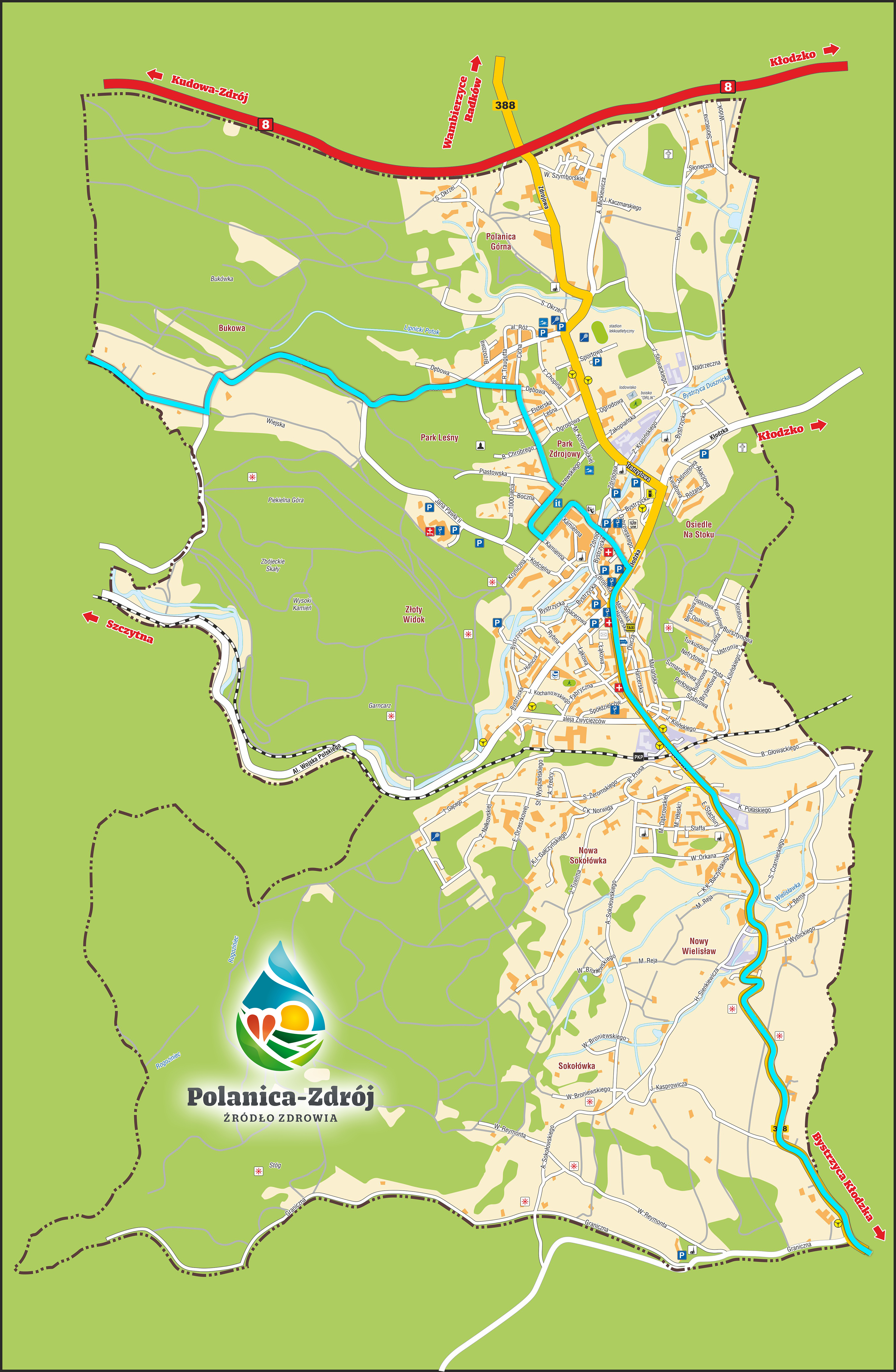 -wjazd od strony Szczytnej ul. Wiejską - ul. Górska - ul. Dębowa - ul. Cicha - ul. Parkowa - ul. Matuszewskiego - ul. Kryniczna - ul. Parkowa- ul. Lipowa - ul. Kłodzka- ul. Warszawska- ul. Kościuszki w stronę Bystrzycy Kłodzkiej