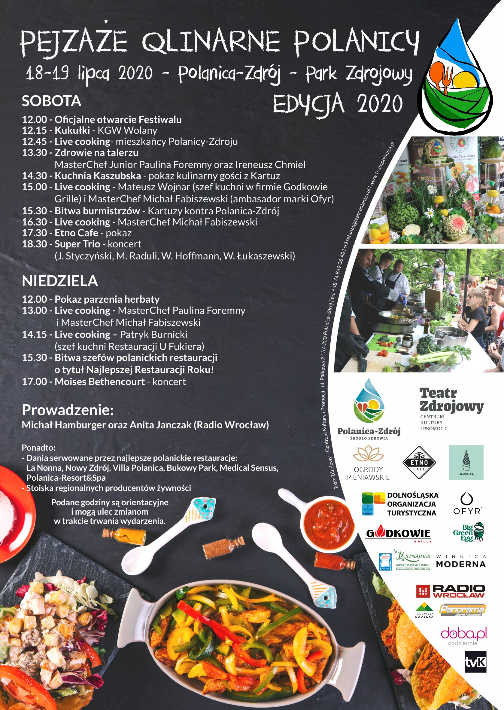Za nami trzecia edycja „Pejzaży Qlinarnych Polanicy”. Podczas weekendu Park Zdrojowy stał się miejscem prawdziwej uczty dla oczu i podniebienia. Począwszy od stoisk ze zdrową żywnością, chlebami, dżemami i mnóstwem innych lokalnych produktów, skończywszy na wyśmienitych daniach serwowanych przez polanickich restauratorów. Nie tylko można było skosztować rozmaitych specjałów, ale także obejrzeć popisowe live coockingi w wykonaniu: Pauliny Foremny - MasterChefa Juniorów, Michała Fabiszewskiego – MasterChefa , Patryka Burnickiego - szefa kuchni restauracji Magdy Gessler u Fukiera. Niezwykle ciekawe okazały się również pokazy parzenia herbaty i kawy przez Czajownię i Etno Cafe.